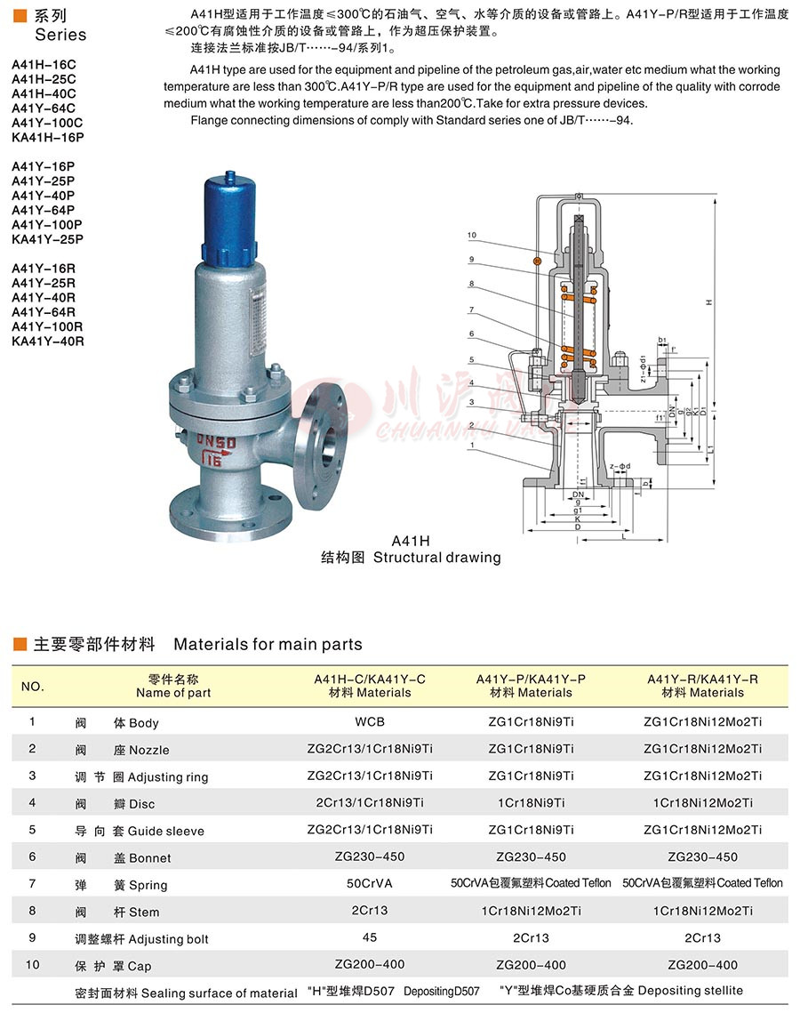 A41H型微启封闭式安全阀适用于工作温度≤300℃的石油气、空气、水等介质的设备或管路上。A41Y-P/R微启封闭式安全阀型适用于工作温度≤200℃有腐蚀性介质的设备或管路上,作为超压保护装置。