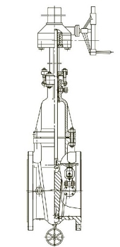 图5所示为明杆楔式单闸板高温吹扫闸阀。该阀是在普通楔式单闸板闸阀基础上,在阀体、阀盖上增加了吹扫装置,通过吹扫装置注入高压水或蒸汽,对易结焦、颗粒状介质的管路、阀门等进行清洗、冲刷,实现在线清除管路、阀门内的杂质,具有方便、省时等优点,有效地提高系统的使用寿命。适用于水、蒸汽、烟气、油品或雾状、粉末状、颗粒状等介质的管路上,作为启闭装置用,尤其适用于石化行业输油和催化裂化装置,起到启闭、清洗冲刷管道的作用。
