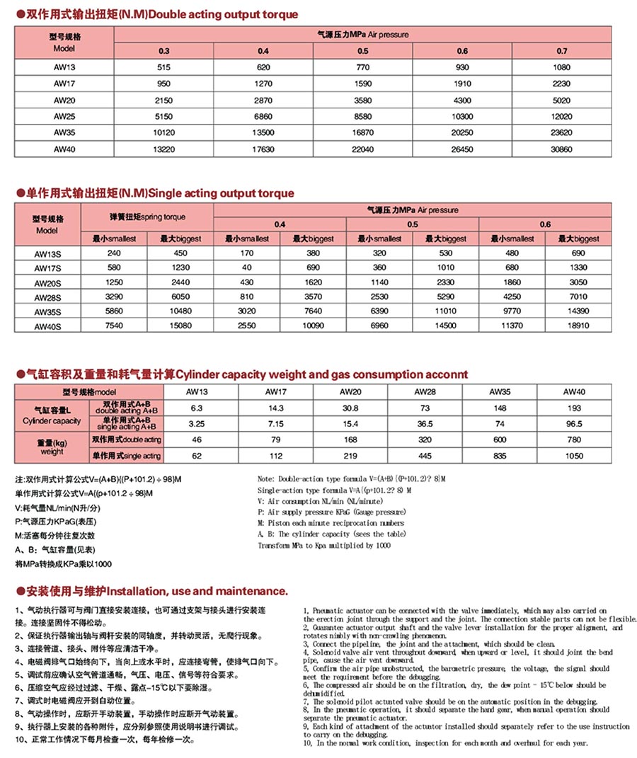 AW气动执行器分为双作用式和单作用式(弹簧复位),两个分体气缸,双活塞,拔叉式传动结构,容易制造大尺寸缸体,输出扭矩大,动作灵活平稳;气缸体内壁和活塞轴镀硬铬,有很好的抗磨性;所有滑动部件之间配有无润滑轴承和导向环以降低摩擦系数,延长使用寿命。AW气动执行器的U型曲线特性输出扭矩更适用于大口径球阀、蝶阀的开关和调节,也可用于其他90回转场合。
