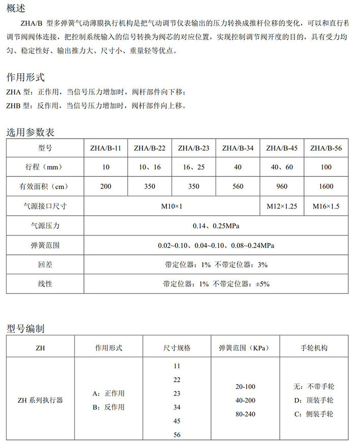 ZHA型:正作用,当信号压力增加时,阀杆部件向下移;